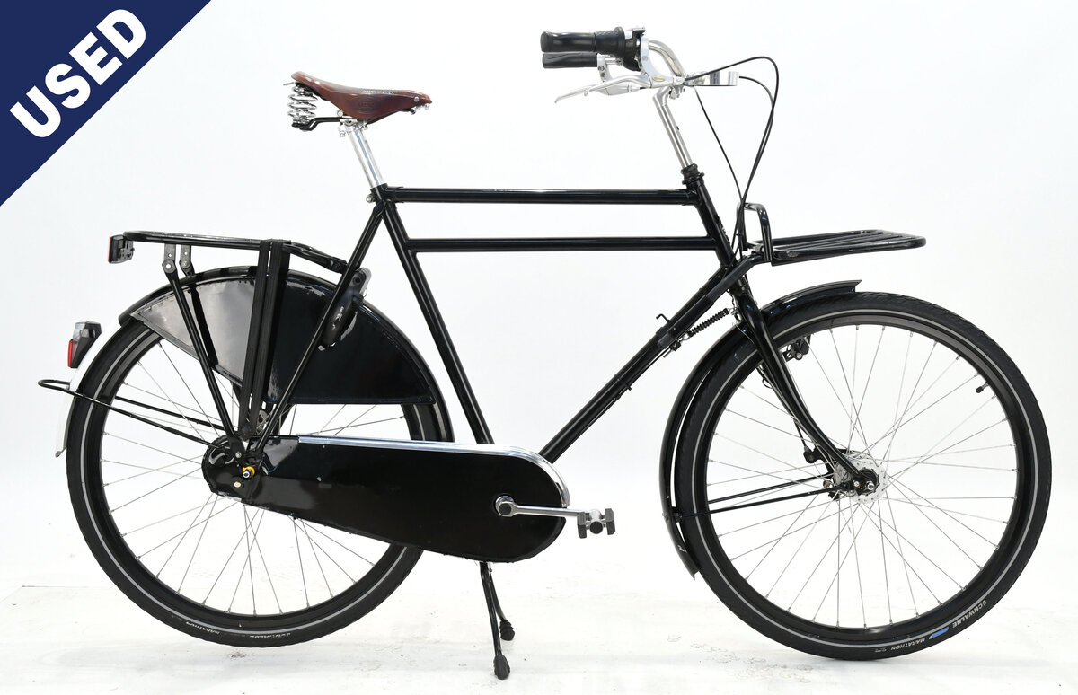 Check out this sweet dutch bike! Lots of scuffing and scratches throughout. Some surface rust on parts. Majority of scuffing is on frame, fork, racks and fenders. Rear rack rubber strap is a bit dry. Tires are a little on the dry side too but still have lots of life left. New chain. New brake cables.