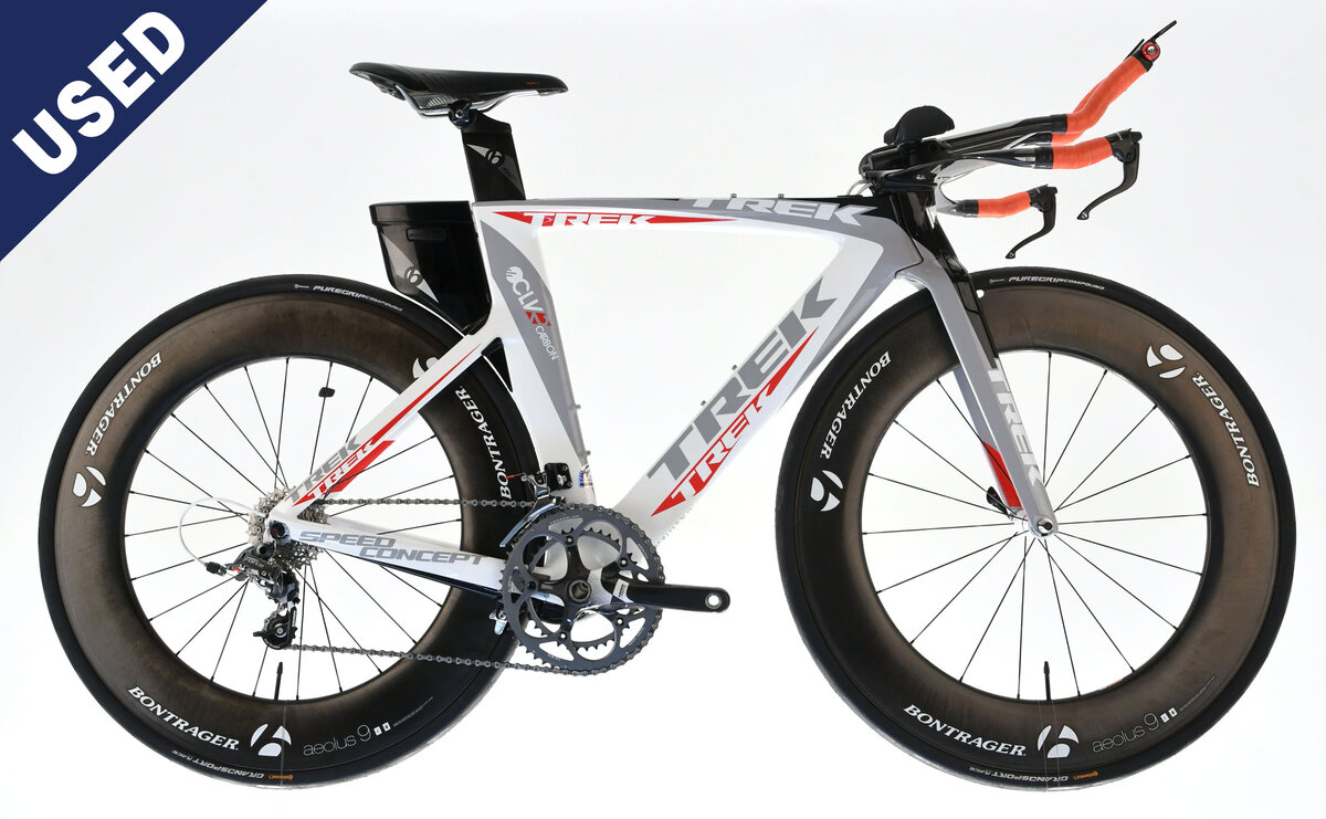 9.9 Speed Concept with 9.8 Sram Force drivetrain. Moderate scuffing throughout bike from use. Notable scuffing on crank arms and bar extensions. Paint chipping on top of fork and downtube. New tires. New bartape.